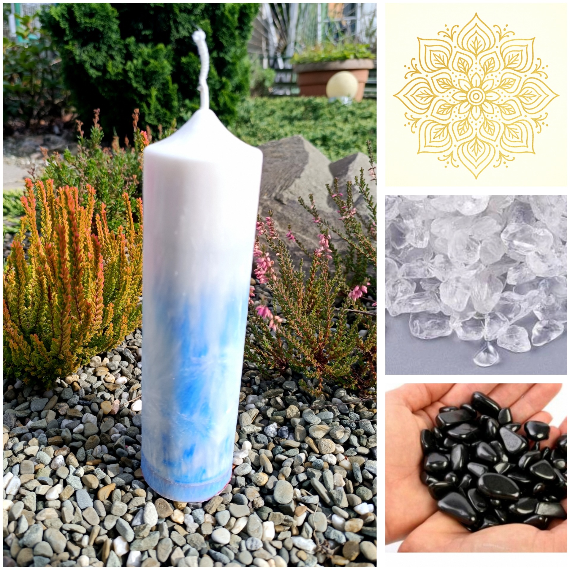 Uvnitř svíce je ukryt křišťál pro čistotu a šungit pro ochranu, doplněné o špetku skořice pro odvahu a stabilitu.
