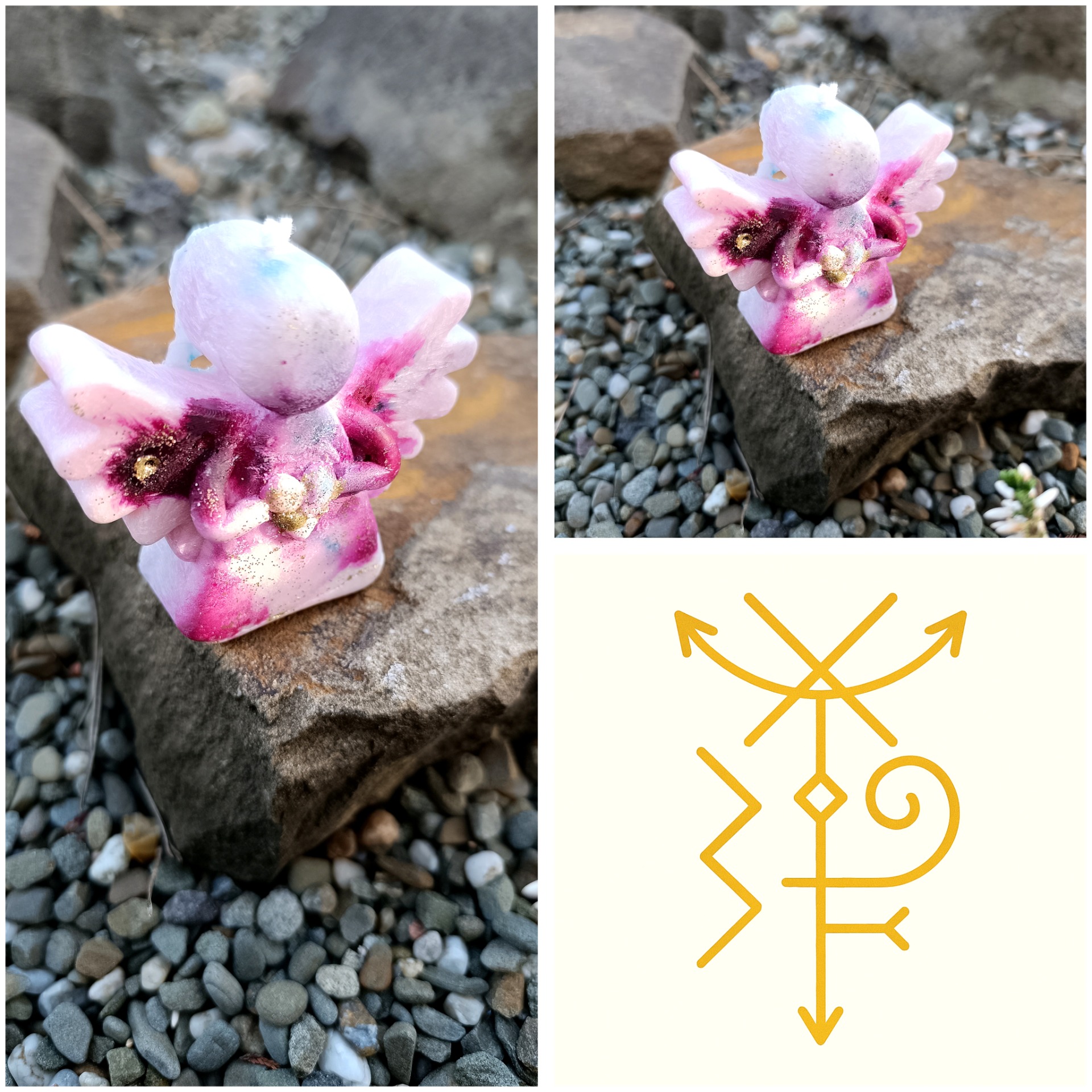 Bílá barva symbolizuje čistotu a ochranu, růžová křídla jemné obejmutí srdce a malé zlaté srdíčko v rukou nese energii lásky a podpory.