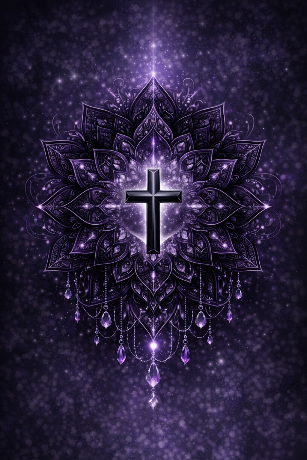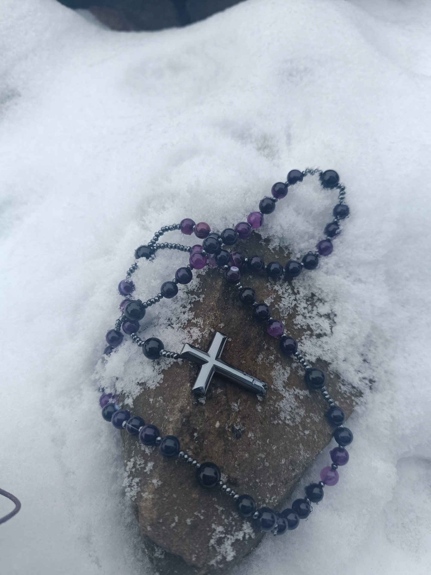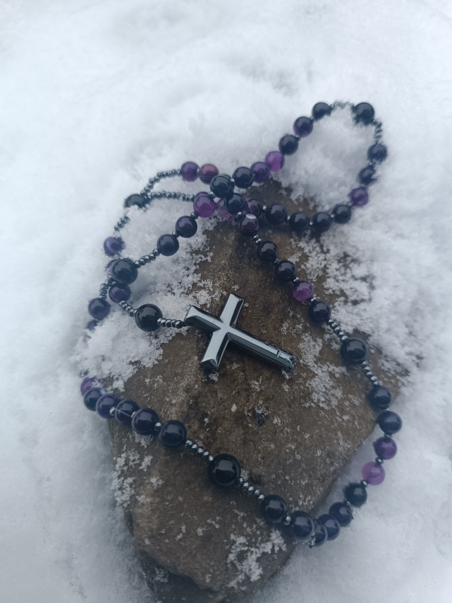 Kombinace tmavých ochranných minerálů s křížem jako symbolem světla, osy a ukotvení vytváří tiché, ale pevné pole ochrany.