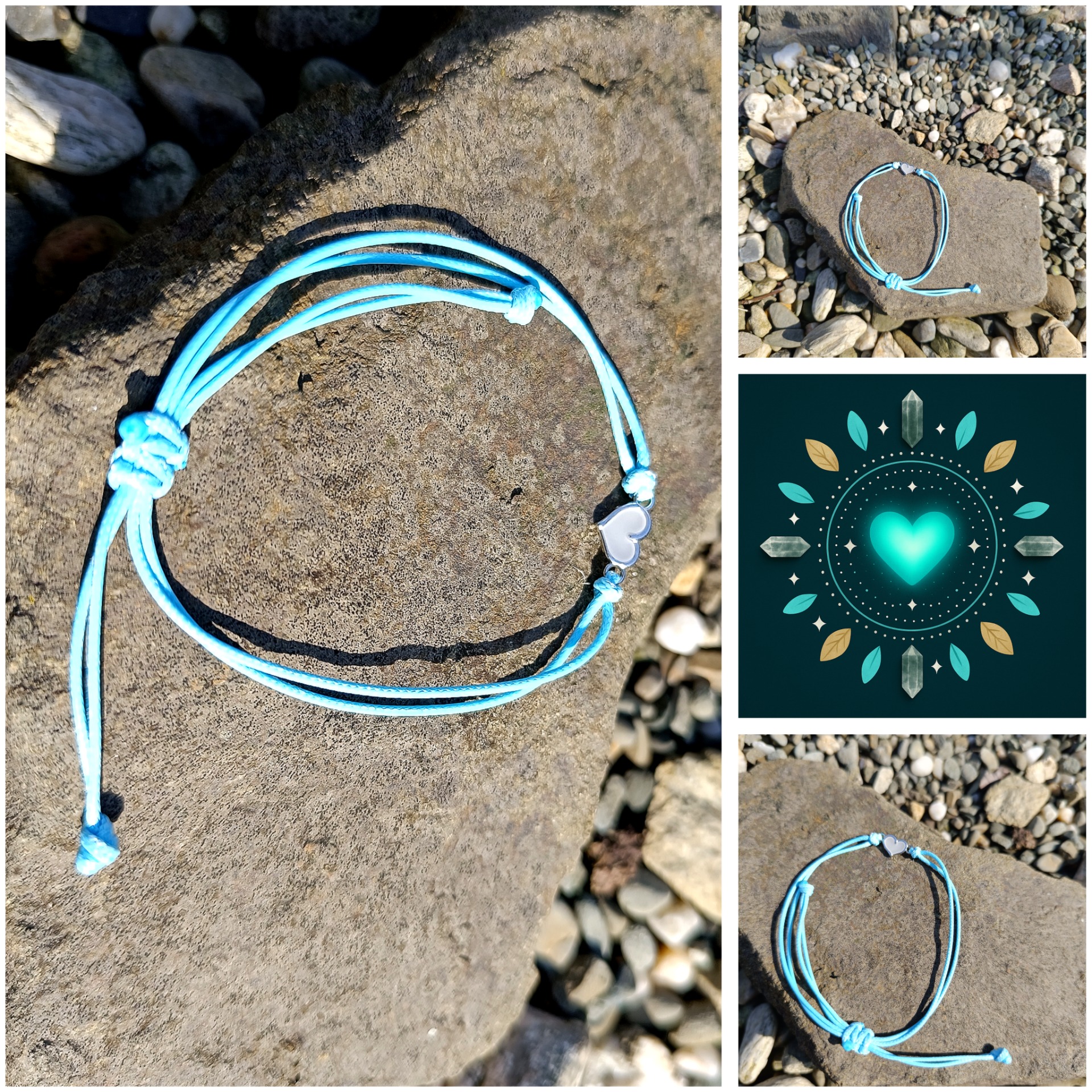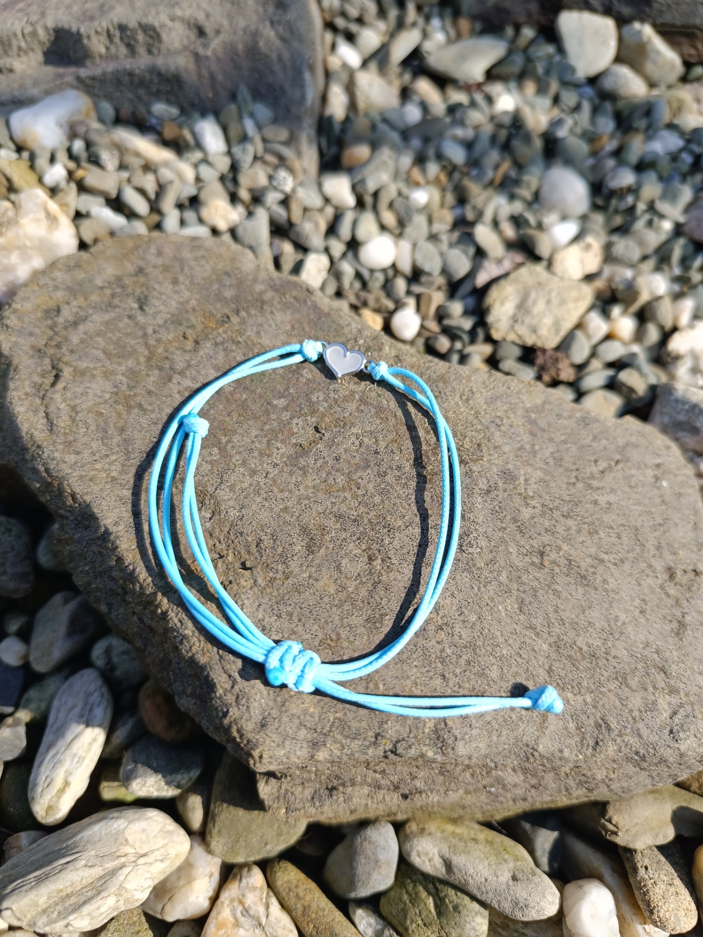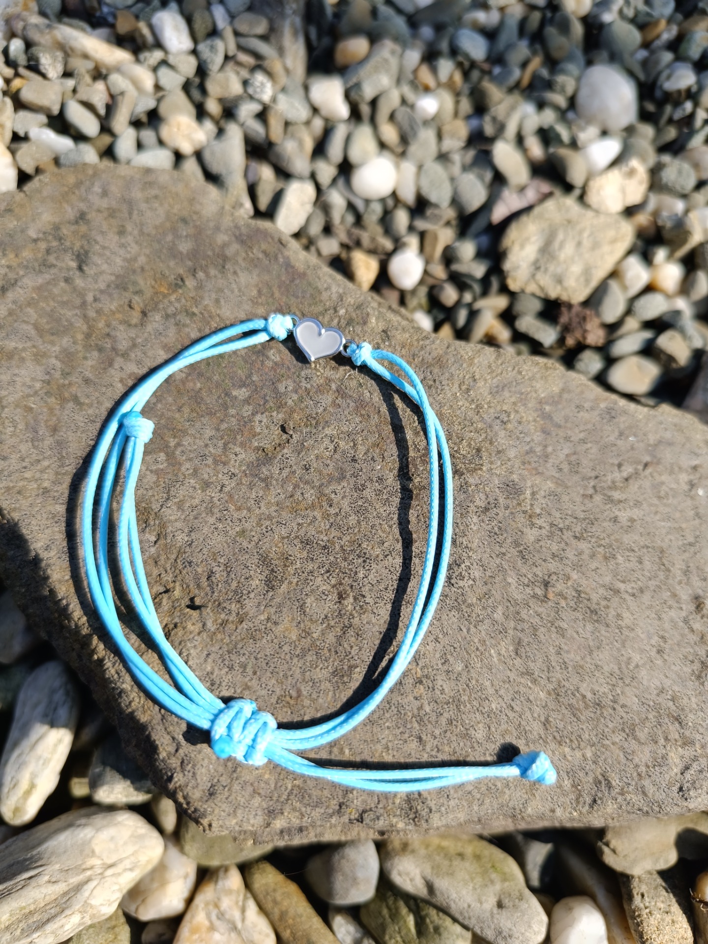Jemný provázkový náramek v nebesky modré barvě s kovovým srdíčkem, které v noci svítí. Připomíná, že světlo a láska tě provází i v těch nejtemnějších chvílích.