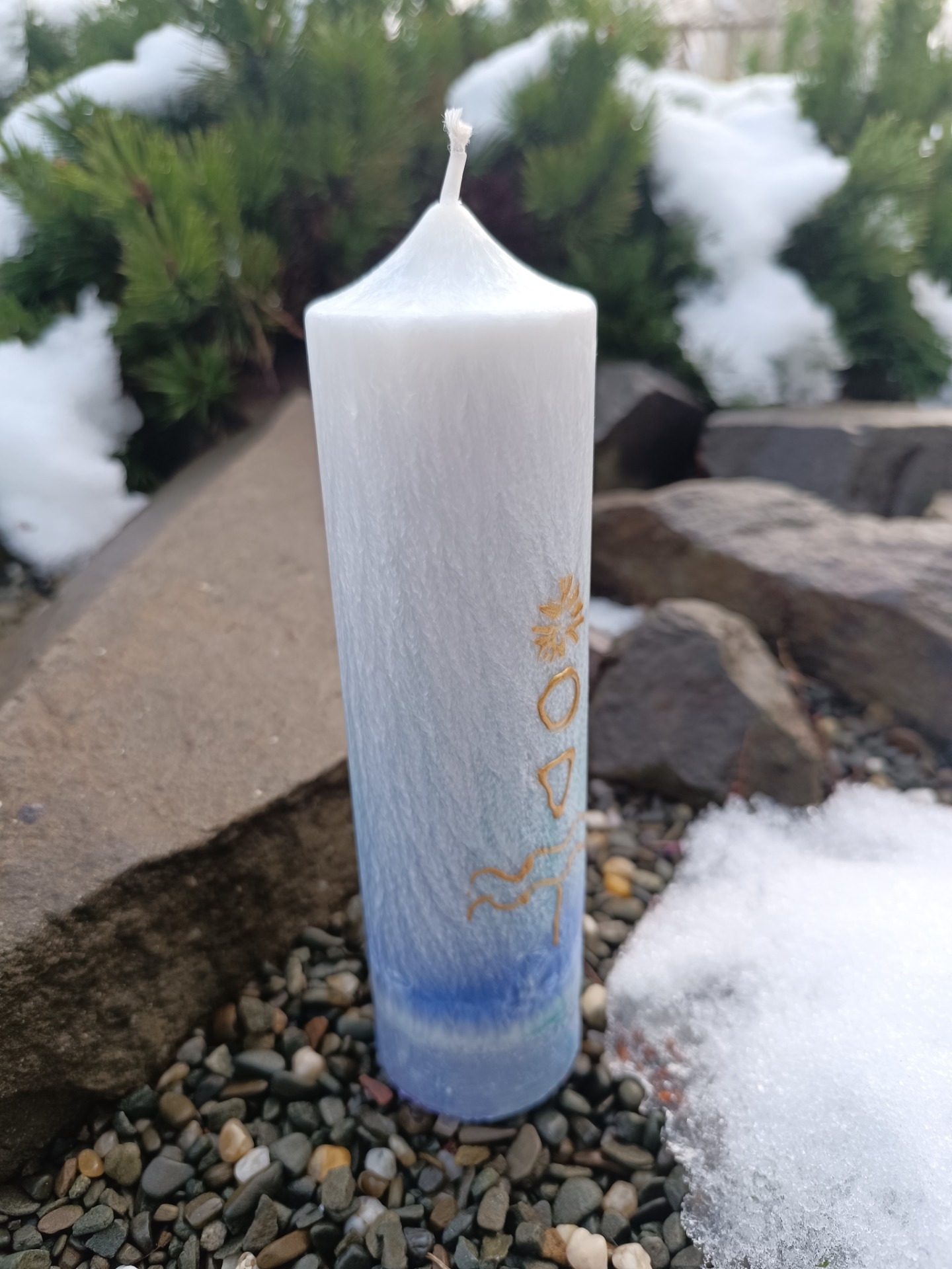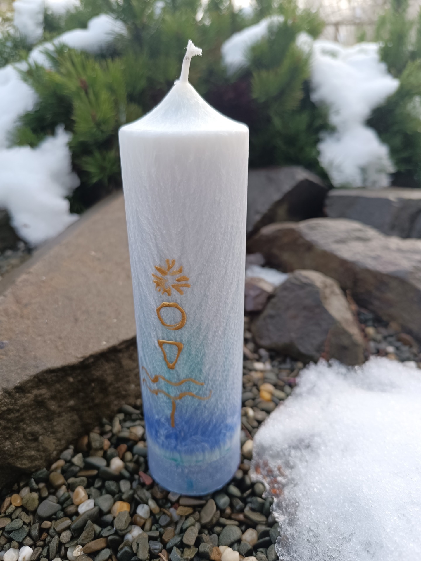 Na svíci je ručně malovaný světelný kód ochrany a klidu, který: