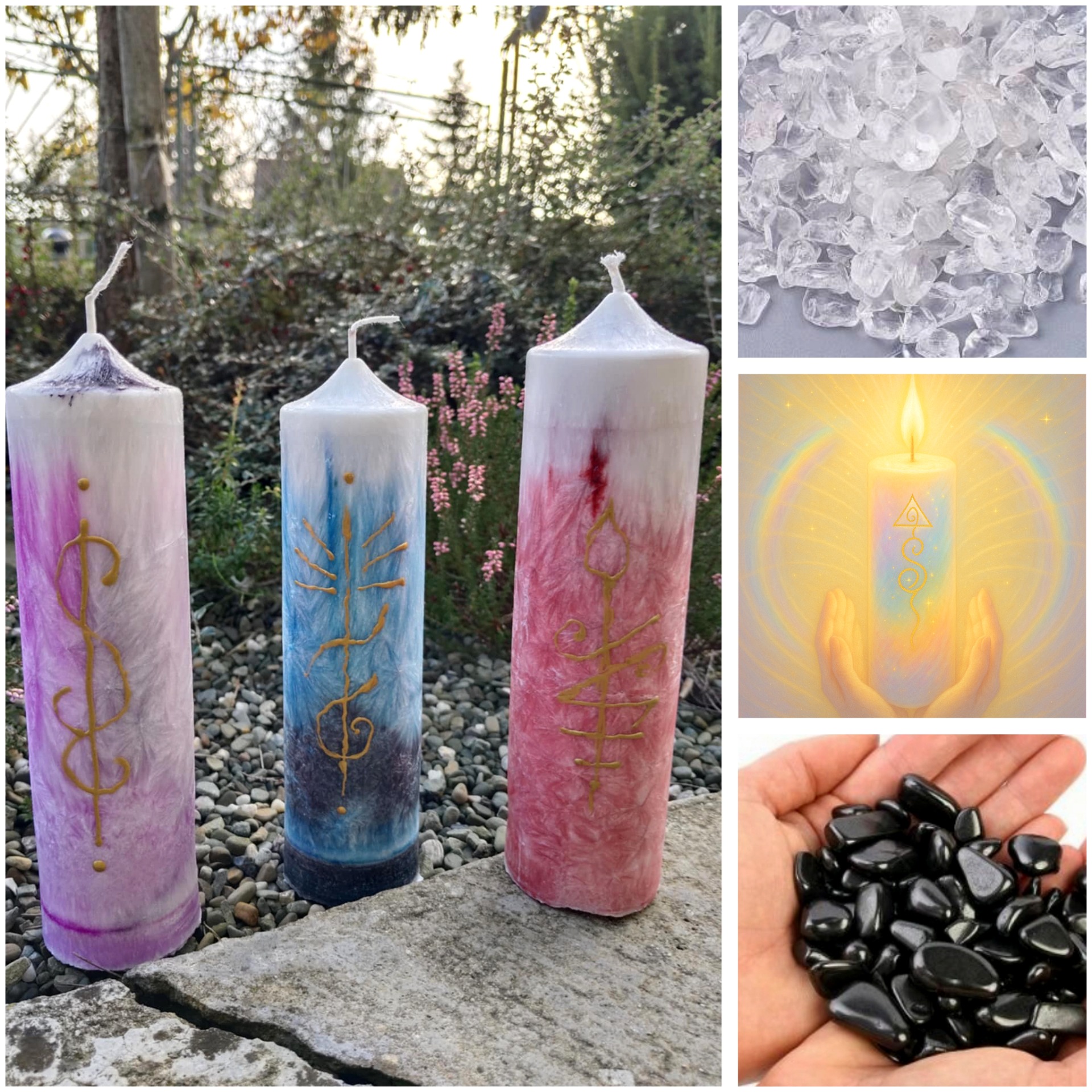 Každá svíce je ručně tvořena z palmového vosku, se zlatým světelným kódem a vloženými minerály křišťál a šungit – pro čistotu, ochranu a ukotvení světla v hmotě.