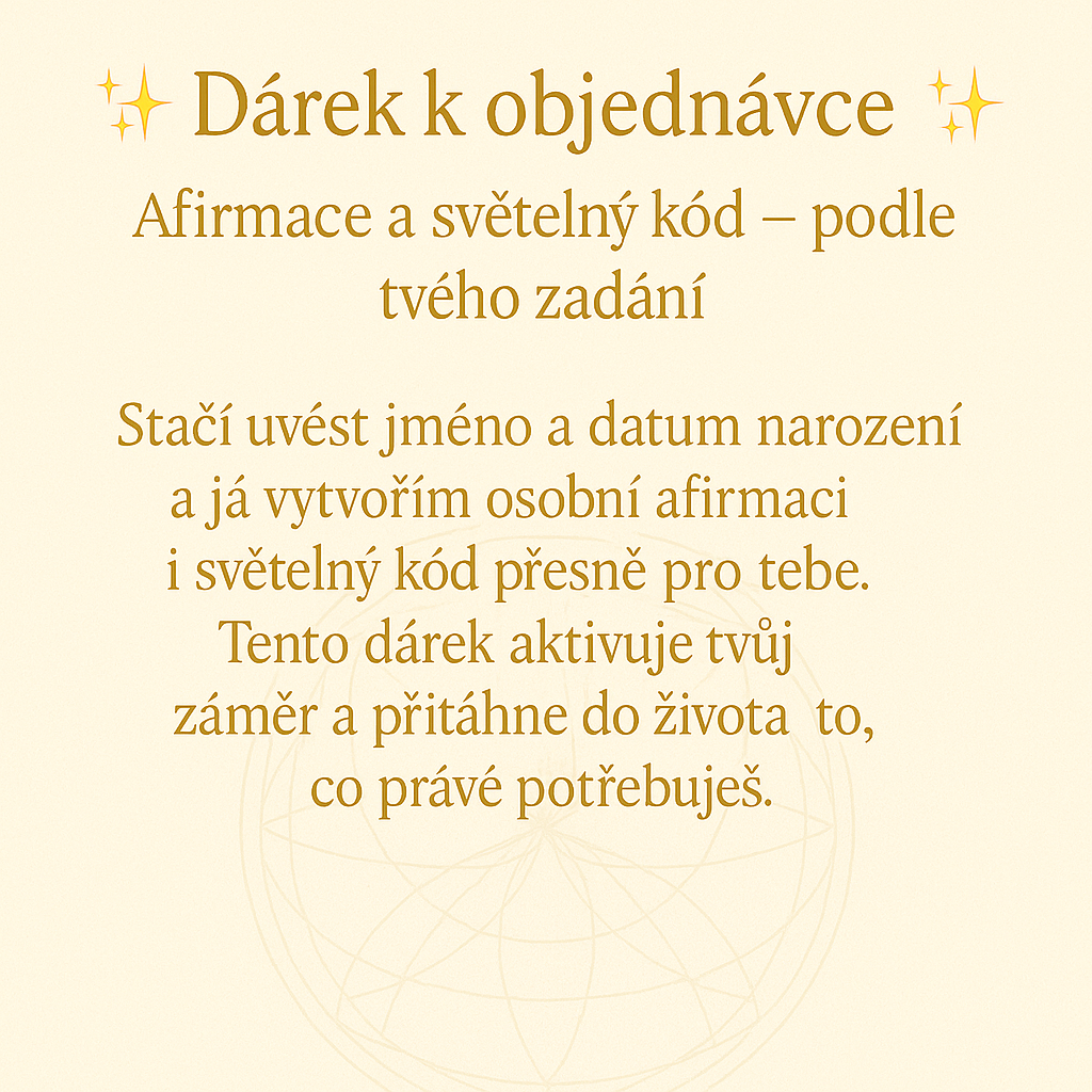 Ke každé objednávce získáš jedinečný dárek zdarma – osobní afirmaci a světelný kód vytvořený na základě tvého jména a data narození.