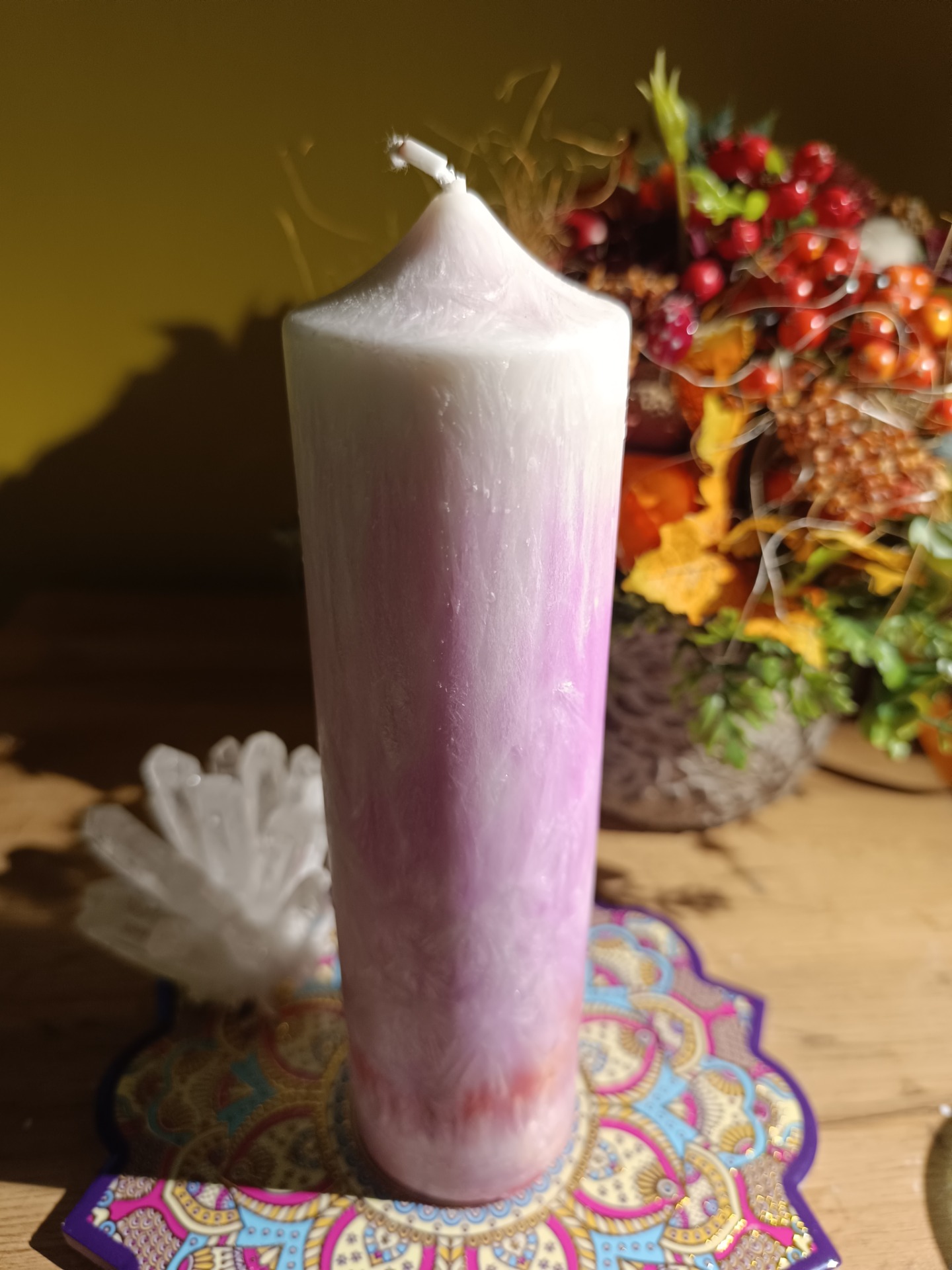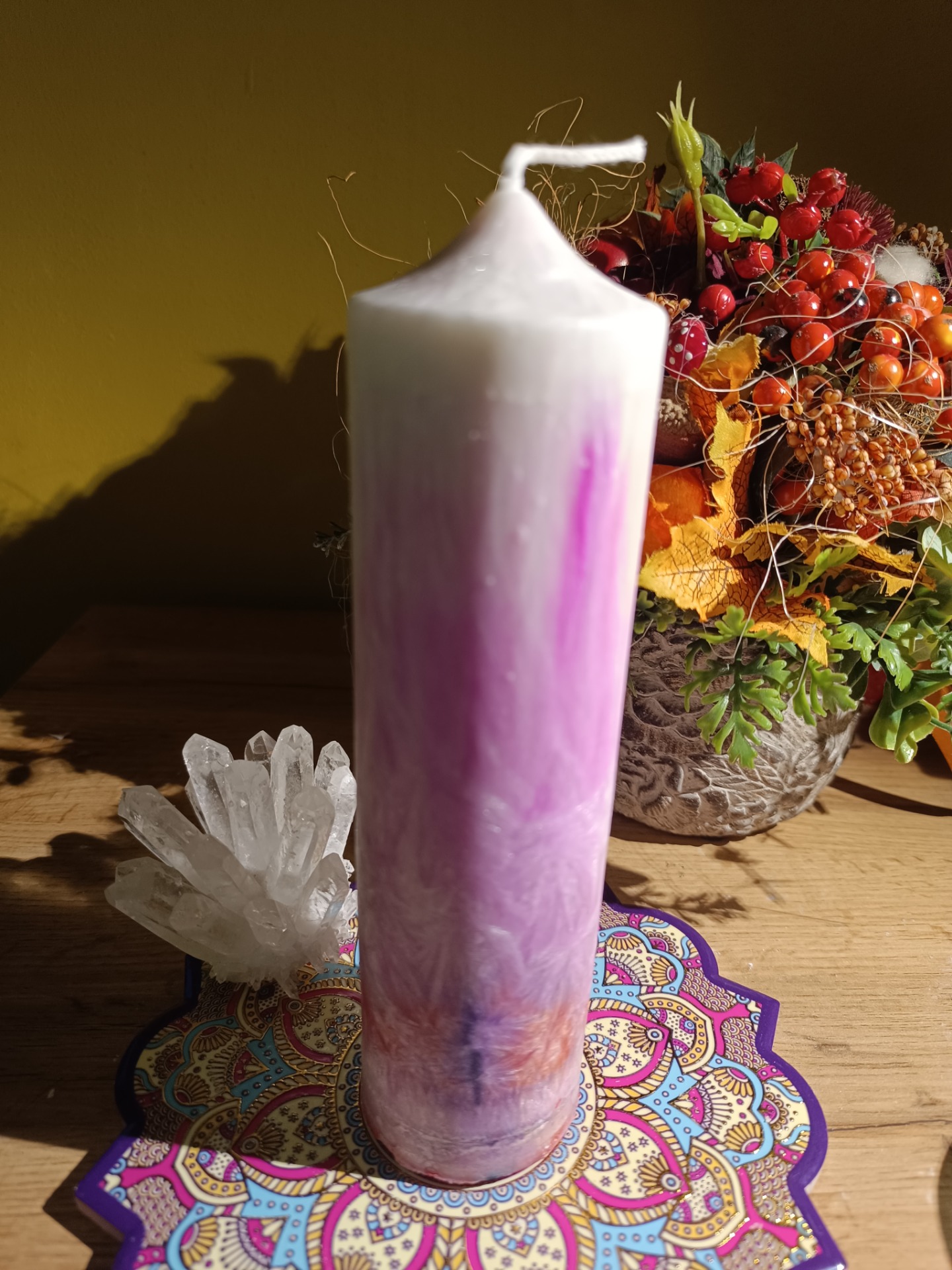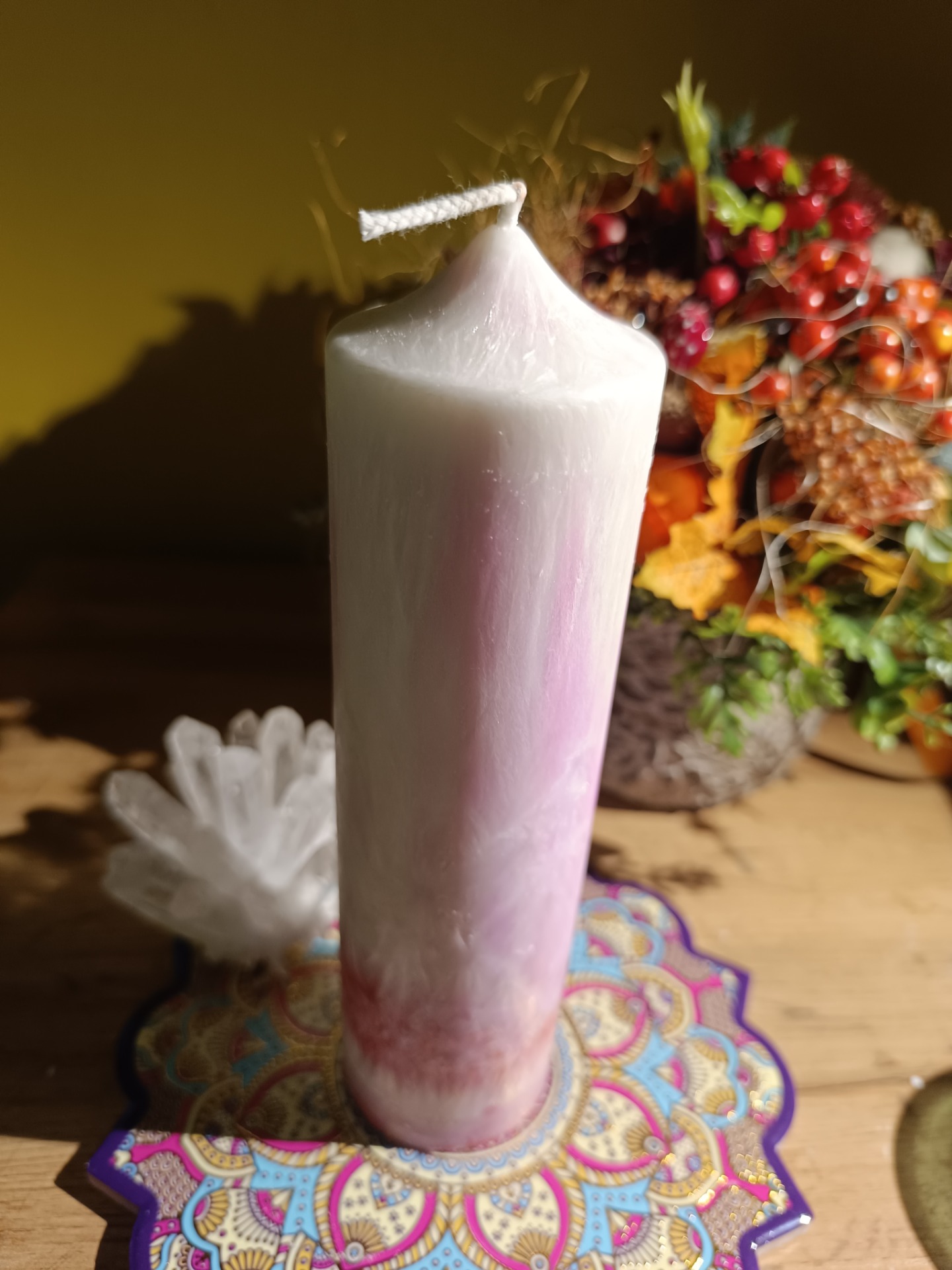 Tato ručně vyrobená svíce propojuje jemnost andělských energií s ohněm vnitřní síly.
