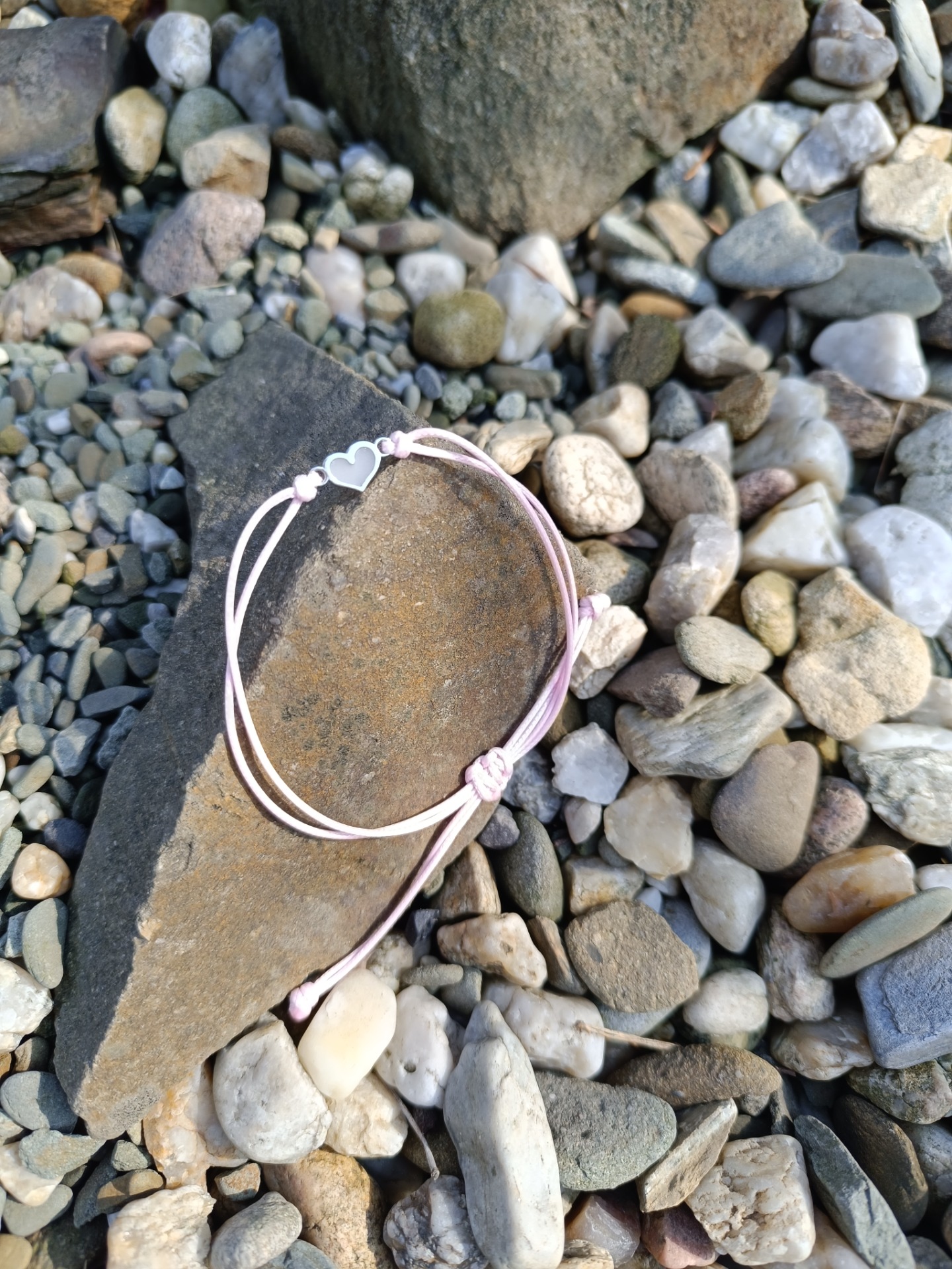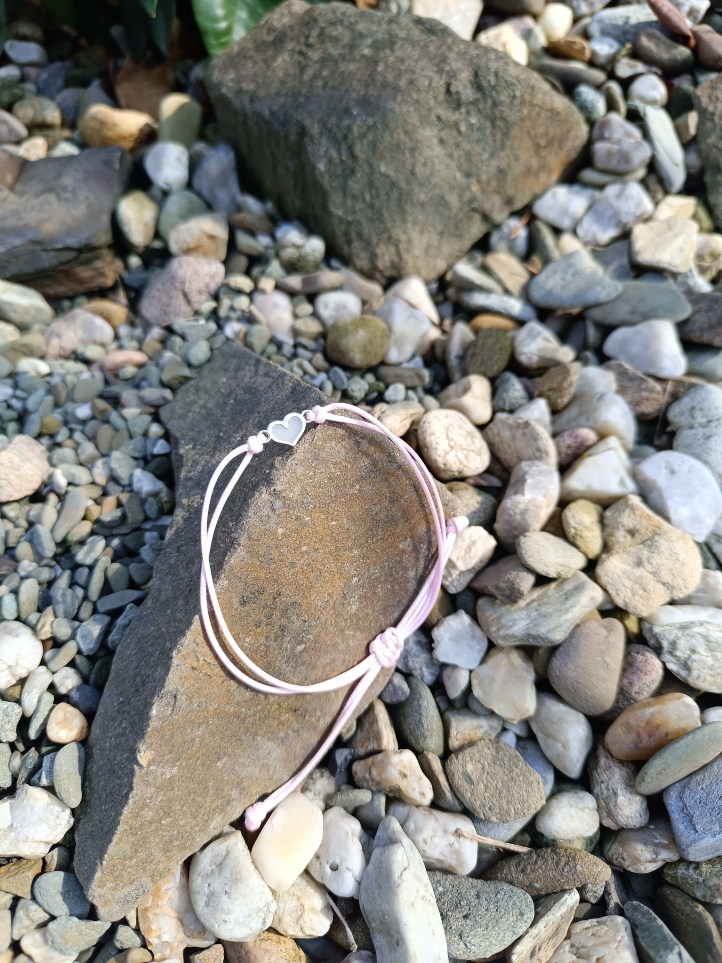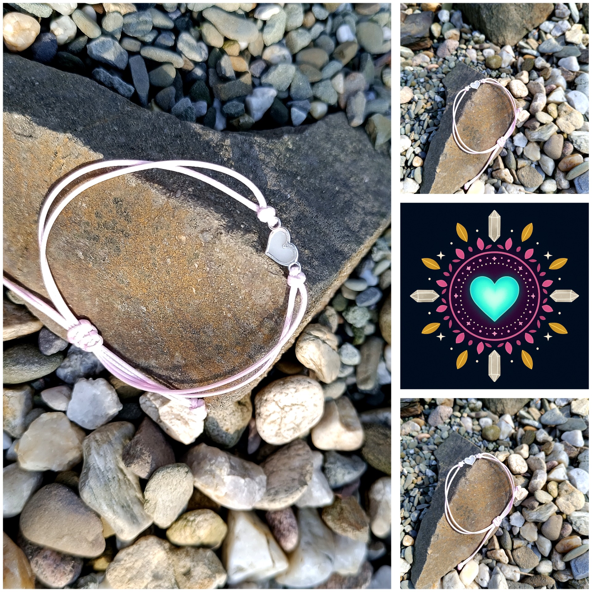 Jemný náramek na růžové šňůrce s malým kovovým srdíčkem, které v noci září .