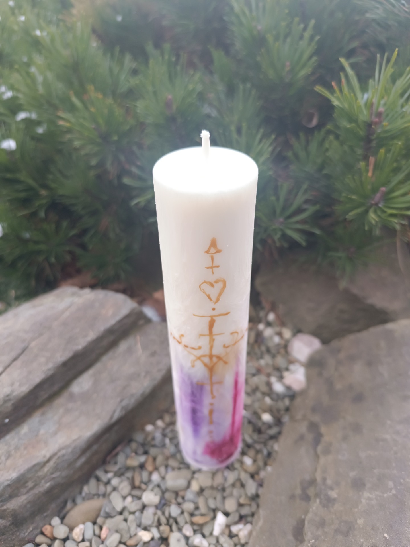 Tato svíce vznikla jako stabilní nositelka světelného kódu, který pomáhá usadit se ve své hodnotě, zklidnit vnitřní tlak a otevřít přirozený proud hojnosti.