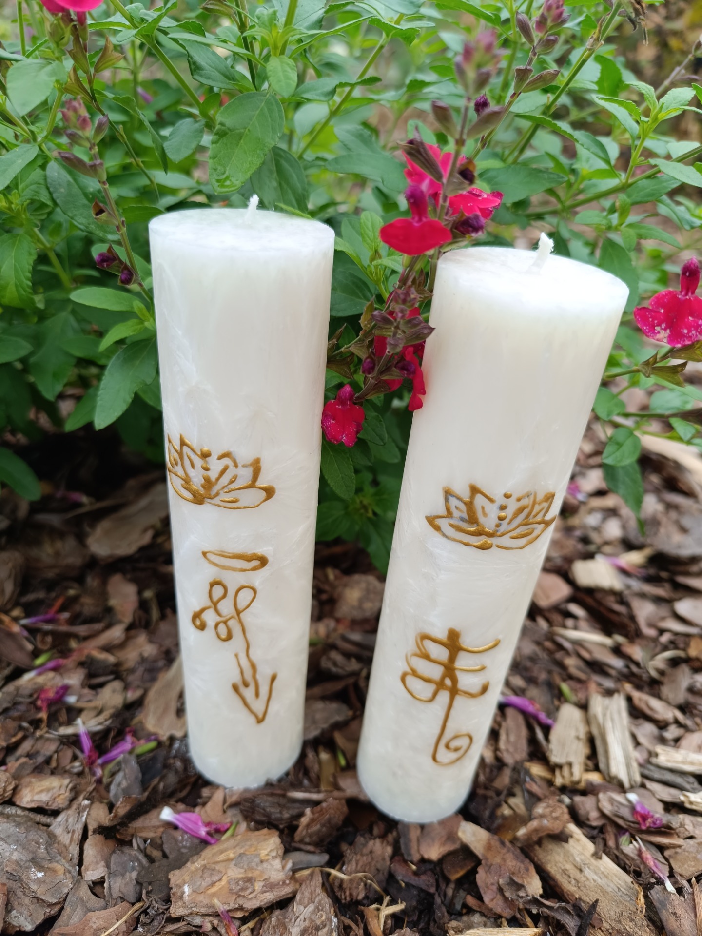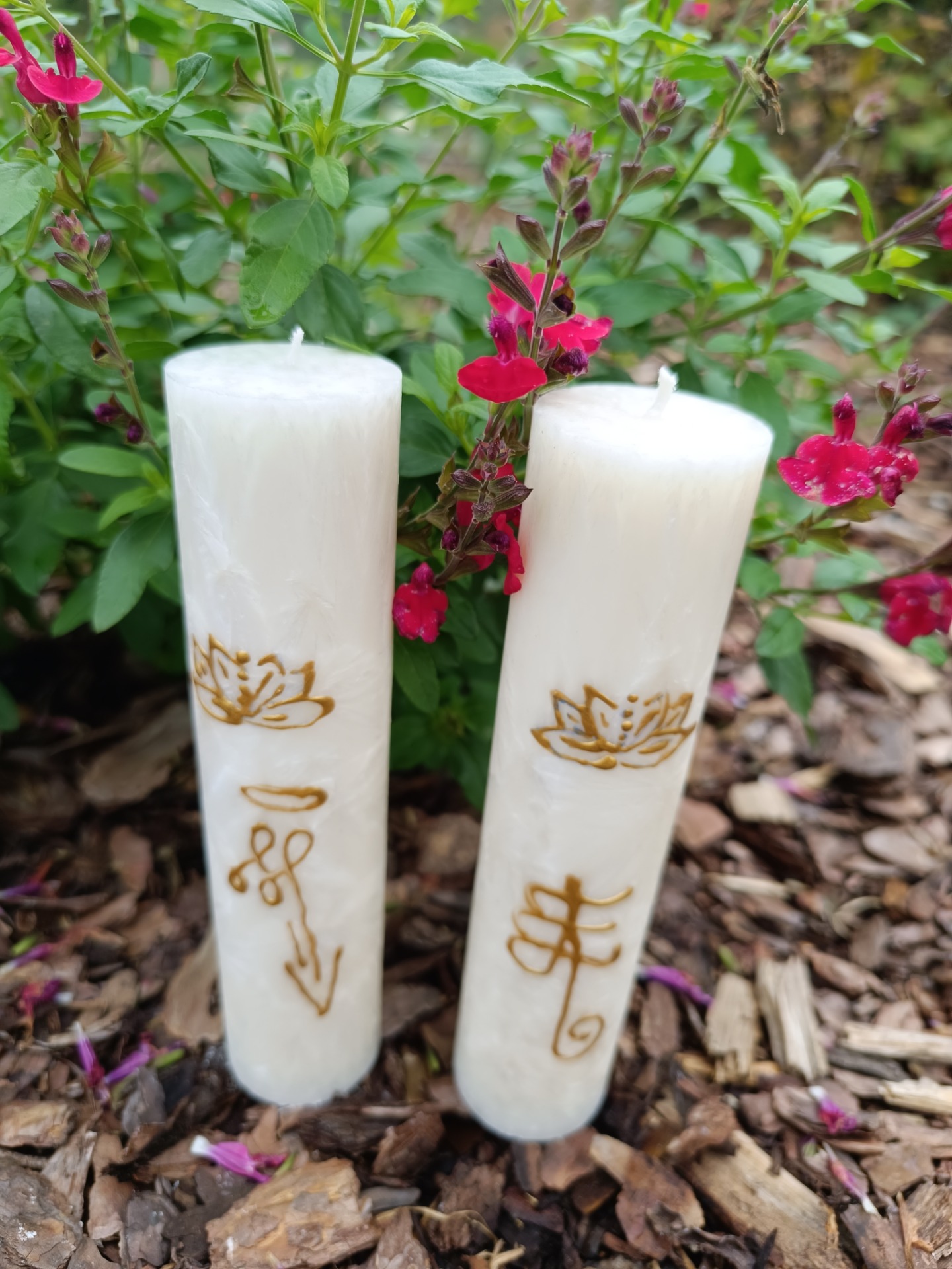 Dvě ručně vyráběné svíce s lotusem tvoří mocný ochranný štít proti cizím energiím, entitám a negativním vlivům. Každá svíce je originál, nabitá čistou energií Zdroje a propojená s vysokovibračními systémy, které zesilují její účinek.
