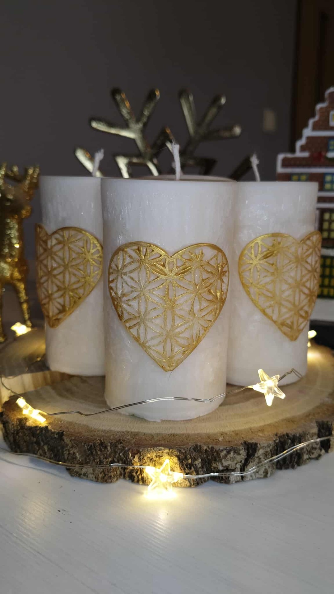 Každá svíce je ručně vyrobená z čistého palmového vosku, zdobená zlatým srdcem se symbolem Květ života – prastarým znakem propojení, jednoty a nekonečné energie.